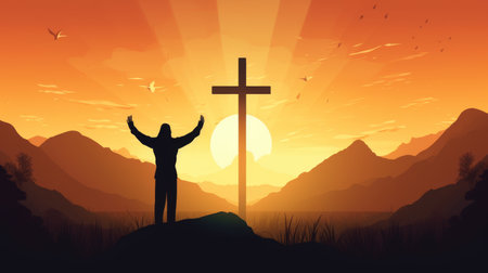 A serene silhouette of a person raising hands in worship toward a cross at sunrise, surrounded by beautiful mountains and a tranquil landscape.