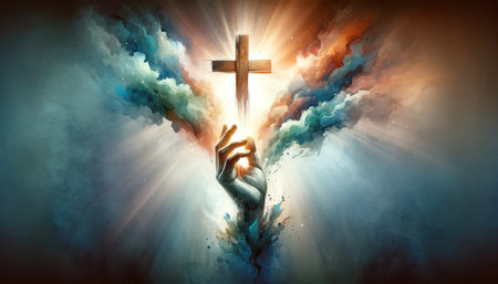 Hand with cross and colorful smoke in the sky. Digital illustration.