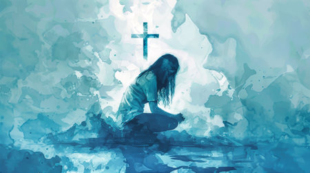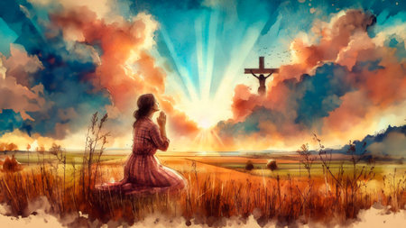 A woman kneels in prayer, her head bowed in devotion, surrounded by a watercolor-like sky with a cross.