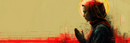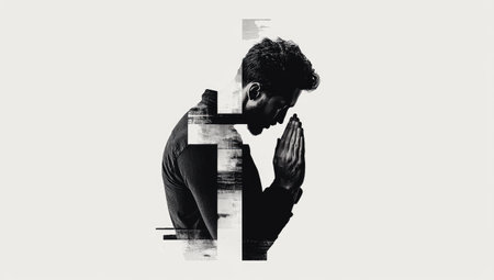 A modern double exposure illustration combining faith and geometric abstraction, reflecting spirituality and devotion.