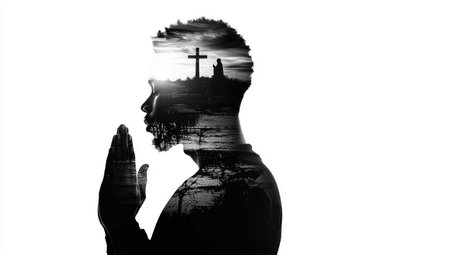 A double exposure image of a person in prayer, symbolizing deep faith and spirituality.