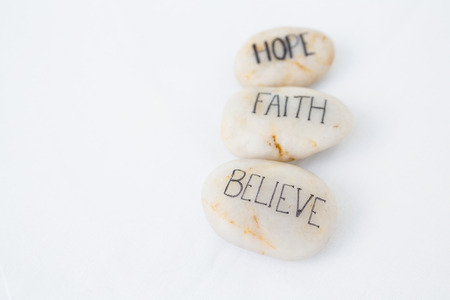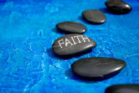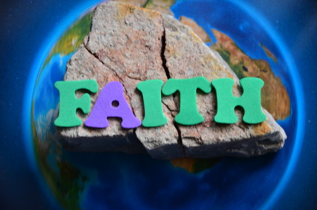 Word FAITH made with cement letters on grey marble background. Copy space. Biblical, spiritual or christian reminder