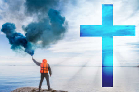 Calling God for help. Concept - man seeks help in religion. Cross as a symbol of religion. Man gives a signal of SOS. Guy with a smoke bomb near sea. Concept - got into trouble refers to the church