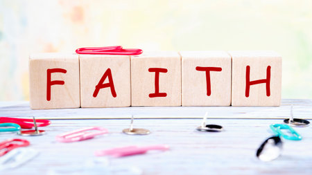 Faith, blue words on wooden cube blocks on brown wood desk and green nature background with sunlight, close up.