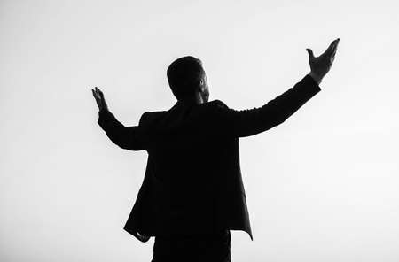 businessman hand praying and worship to GOD Using hands to pray in religious beliefs and worship christian in the church or in general locations in vintage black tone or copy space.