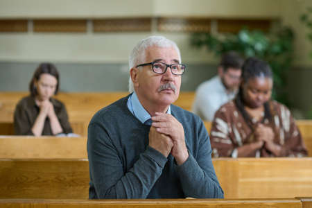 Aged man in casualwear and eyeglasses keeping his hands put together during silent pray while looking at cross in church
