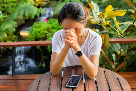 Picture of Christian Asian woman praying to GOD while sitting in the church