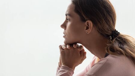People and hope concept. Close up face female looking up feeling hope and faith. Woman praying. Christianity faith, international day of prayer, female lost in thoughts feel lonely depressed pondering