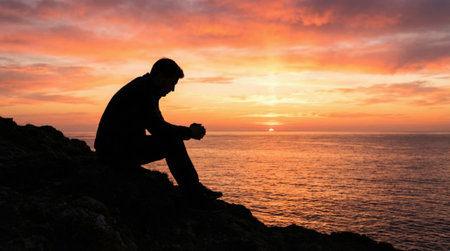 A solitary figure is silhouetted against a stunning orange and pink sunset. The person sits on a rock overlooking the calm ocean, deep in thought or contemplation.