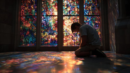 Concept photo of a person kneeling in front of a stained glass window, the light from the colorful pieces illuminating their face as they seek guidance and perseverance through prayer