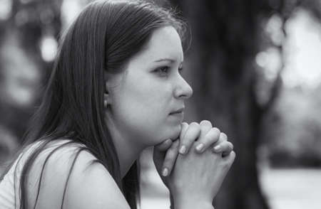 A young blonde 18 year old girl prays with folded hands.