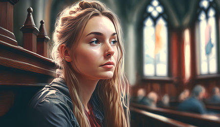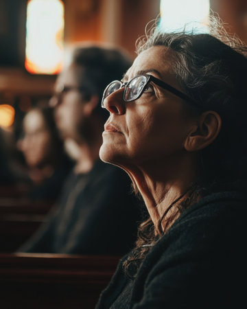 In a church filled with soft natural light, a thoughtful woman in glasses sits in a pew, deep in contemplation, surrounded by others lost in silent reflection, embodying a moment of peace.