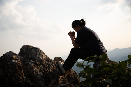 Woman praying to god, posing asian women, girl adult fashionable model, feeling moments, enjoying, happiness on top mountain. Female christian worshipper.