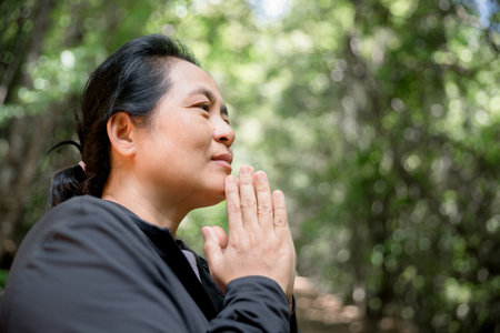 Asian woman with hand in praying position,Female prayer hands clasped together