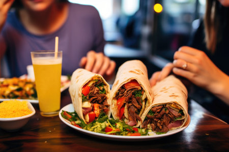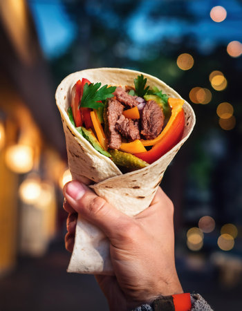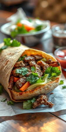 Wrap filled with grilled meat, fresh vegetables, and herbs served in a cozy restaurant during lunch hour