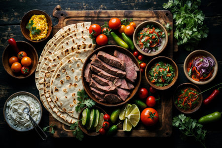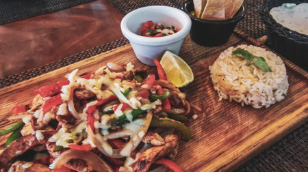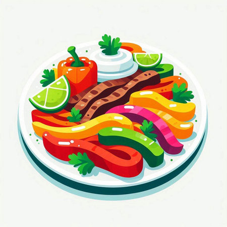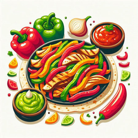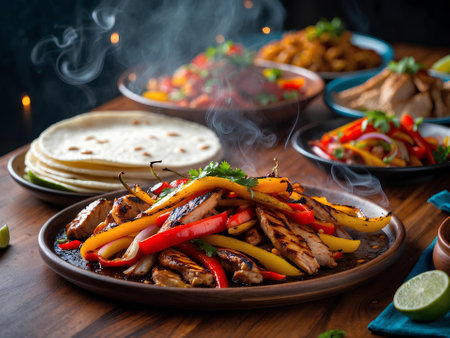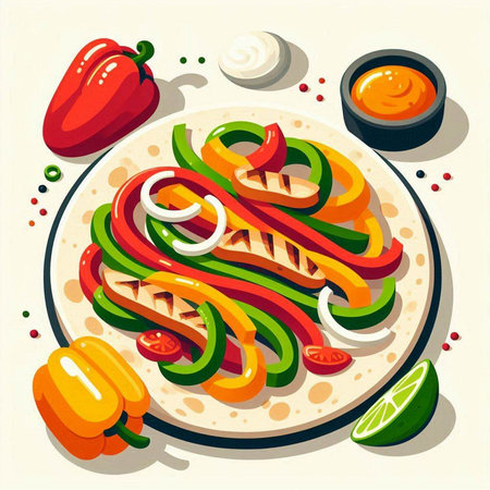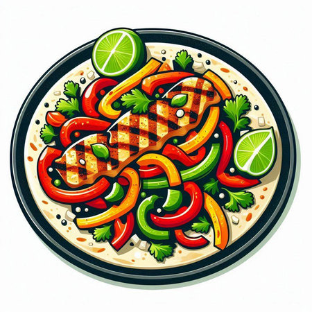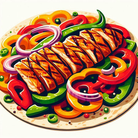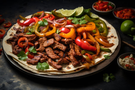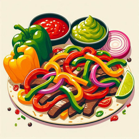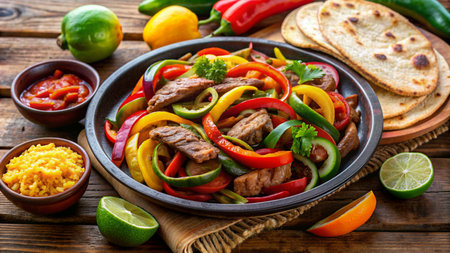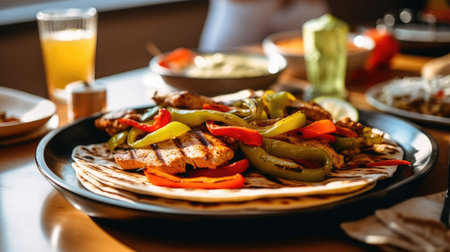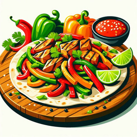Fajitas are a Mexican dish with grilled meat (usually beef or chicken), vegetables and tortillas. AI generated.