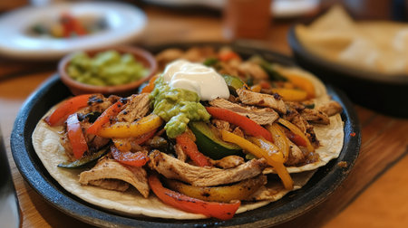 A vibrant depiction of sizzling chicken fajitas served on a skillet, topped with fresh guacamole and sour cream, showcasing a mouthwatering meal.