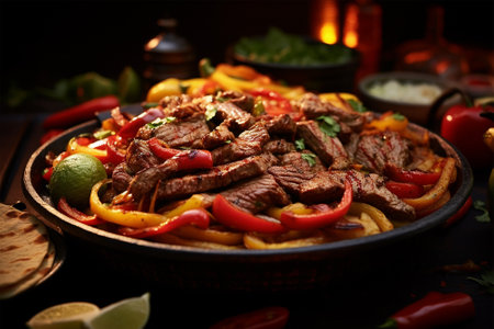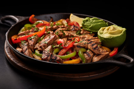 Fajita with beef and colorful bell peppers, served in skillet with tortillas. On dark background. Traditional Mexican dish. Grilled meat with vegetables. For food blog, restaurant, menu, cookbook.