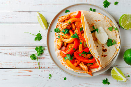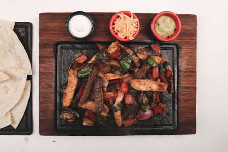Traditional mexican fajitas with chicken, vegetables and tortillas