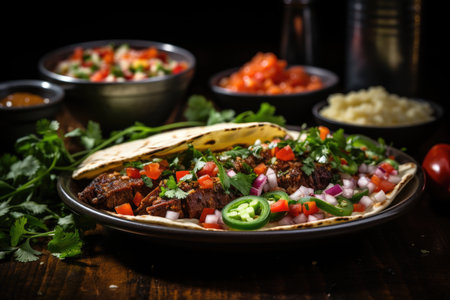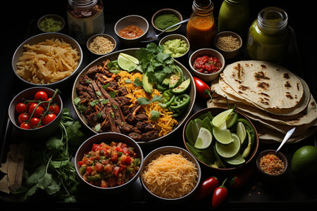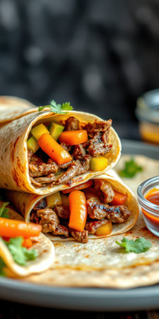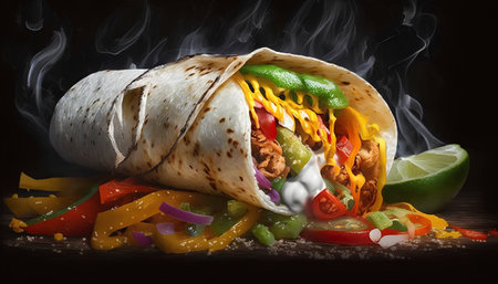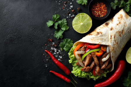 Delicious Mexican food displayed on a black background featuring a wrap filled with grilled meat, fresh vegetables, and vibrant garnishes, ideal for any culinary enthusiast