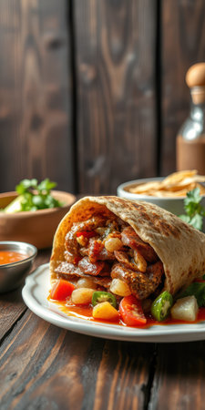 Delicious wrap filled with seasoned meat, fresh vegetables, and savory sauce served on a rustic wooden table