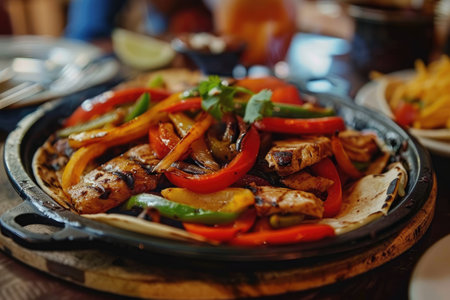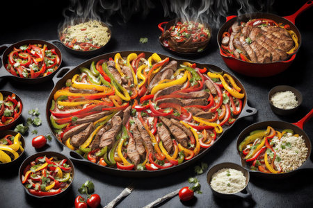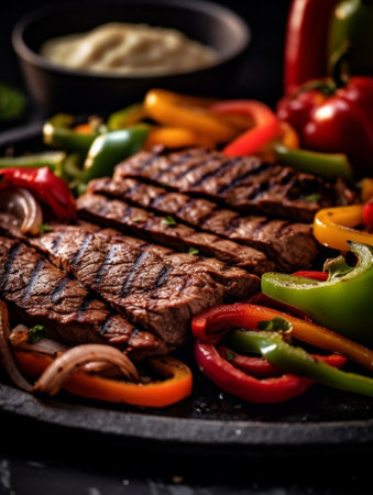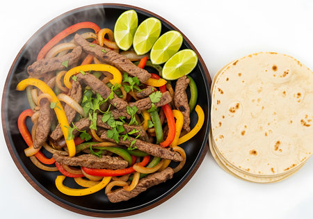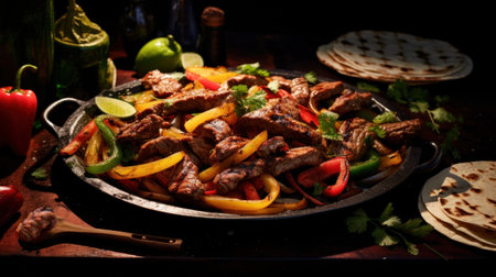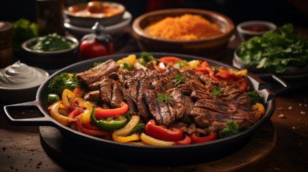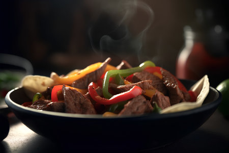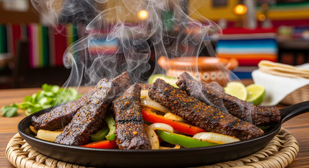 A piping hot plate of beef and vegetable fajitas sizzling and ready to eat.. AI generation