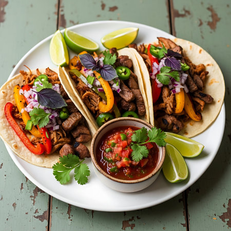 A vibrant and inviting display of a Mexican feast featuring grilled meats, soft tacos, fresh peppers, and mouthwatering salsas arranged on a rustic wooden table.