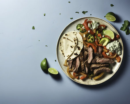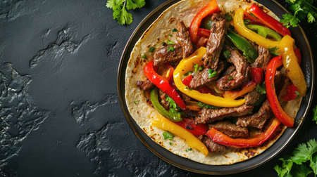 A plate of spicy beef fajitas with saut peppers and onions, top view, with space for copy.