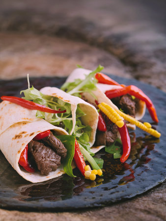 Beef fajitas roll with hot peppers, salad leaves and sweet corn on a stone plate