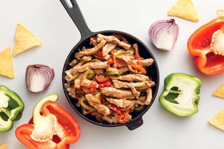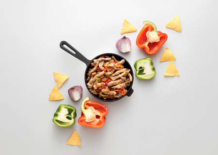 Frying pan with tasty beef Fajita, nachos and vegetables on white background