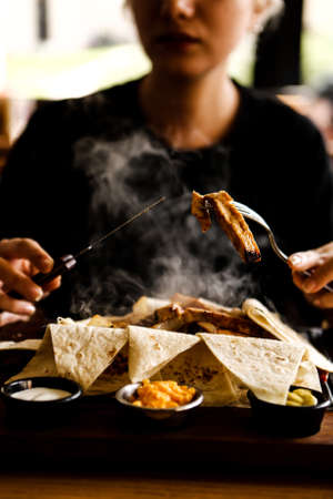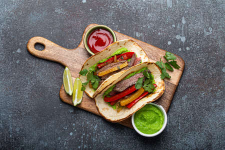 Grilled beef steak. Fajitos, tortillas with salsa, chili and beef on a dark background.