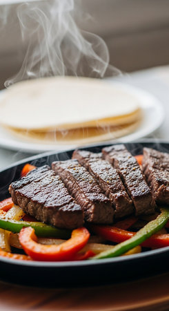 A close-up shot of a sizzling steak fajita dish with colorful bell peppers, onions, and tortillas.