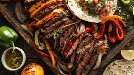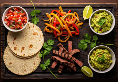 Steak fajita ingredients arranged flat lay style on a dark wooden platter, featuring grilled steak strips, colorful bell peppers, soft tortillas, fresh guacamole, and pico de gallo salsa.