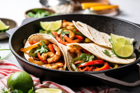 shrimp fajitas in a pan with lime wedges, created with generative ai