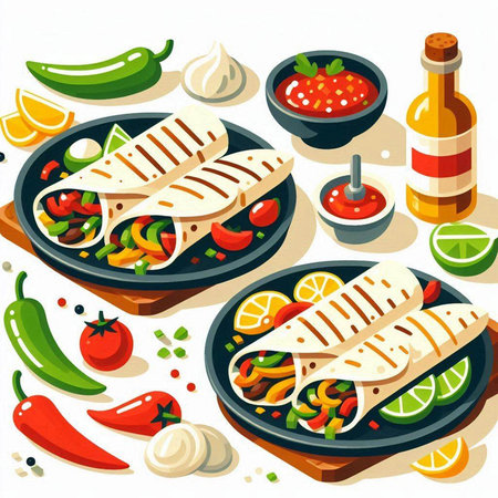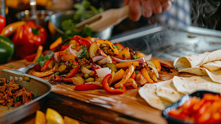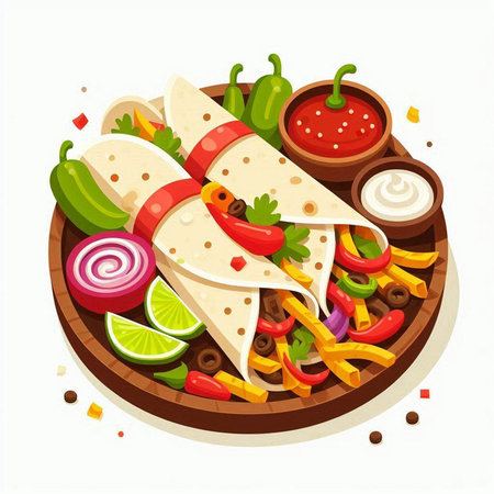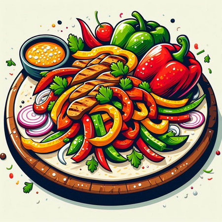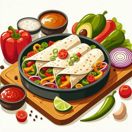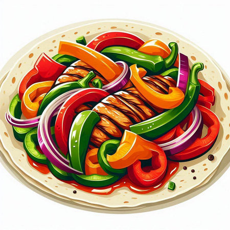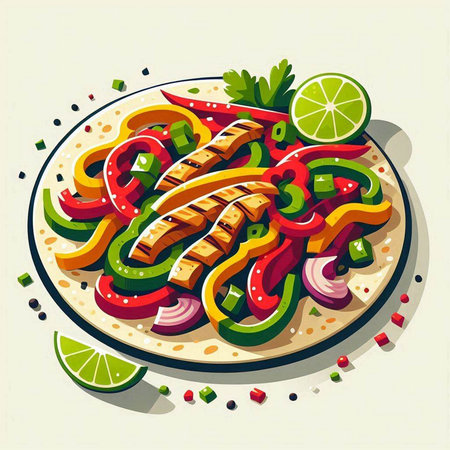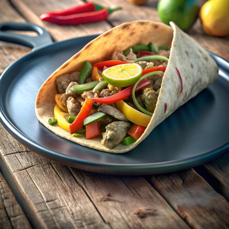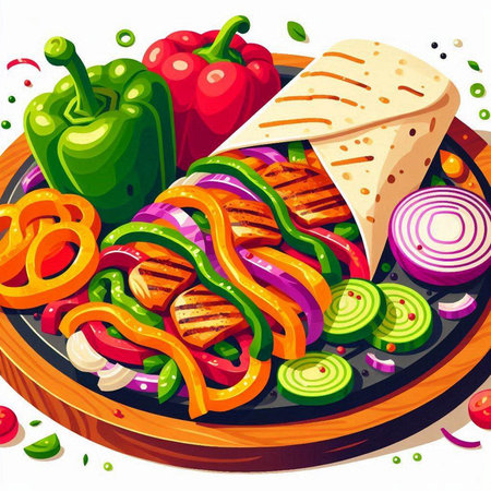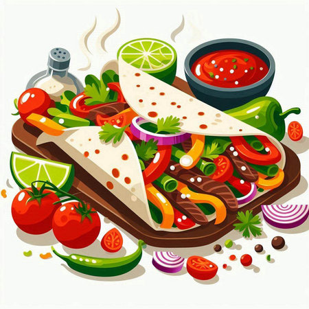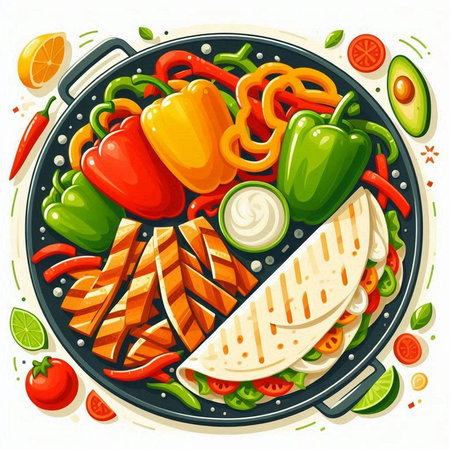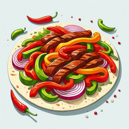 A mouthwatering 3D illustration of a freshly prepared fajita. bursting with vibrant colors and tempting aromas. Perfect for food blogs. recipe websites. and restaurant menus.