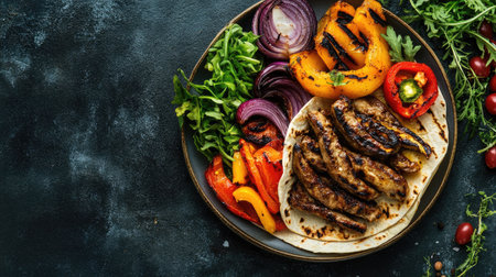 Flat lay of a plate of fajitas with grilled vegetables, open area for text