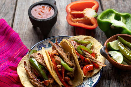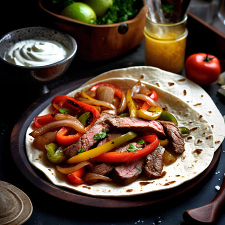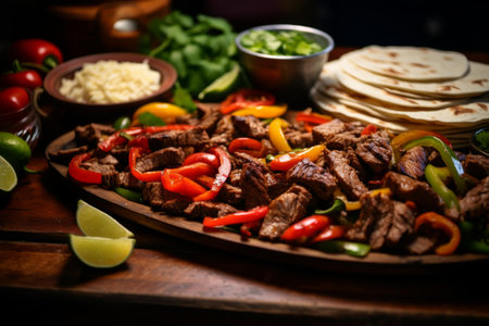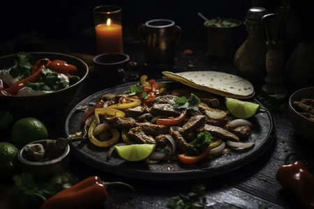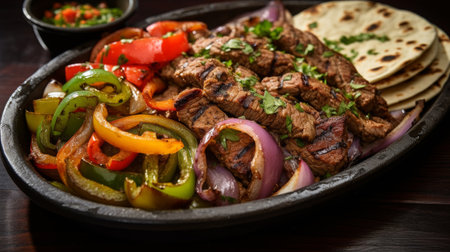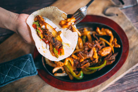Traditional mexican fajitas with meat, vegetables and tortilla