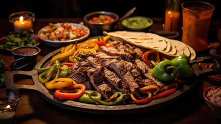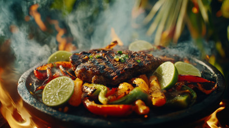 A piping hot plate of beef and vegetable fajitas sizzling and ready to eat.. AI generation