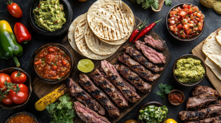 A vibrant spread of grilled meats accompanied by fresh vegetables, salsas, and warm tortillas arranged beautifully on a rustic wooden table.