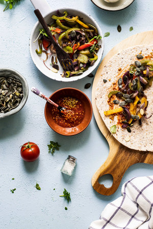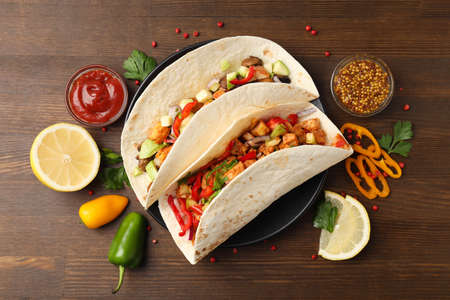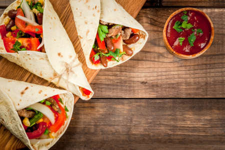 Street fast Mexican food, freshly prepared, homemade sandwiches burrito with beans, beef, corn, peppers, tomatoes and herbs. On the wooden table, top view copy space