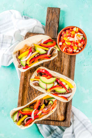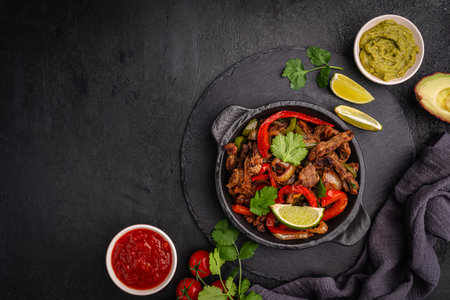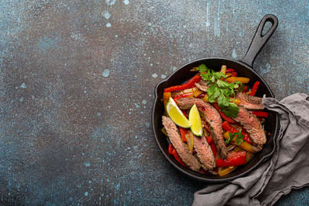 Beef fajita with bell peppers. Tortillas, avocado, sauce served with grilled beef and vegetables on skillet. Tex-mex cuisine