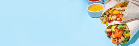 Classic street food shawarma or burrito, healthy sandwich wrapped in tortilla flat bread with fried chicken meat, fresh vegetables, sauce, on bright blue background, top view flat lay copy space