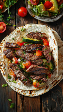 Close-up of tortilla wraps with kebab beef, salad, and vegetables, neatly arranged on a white plate on a wooden table. Fresh and flavorful.