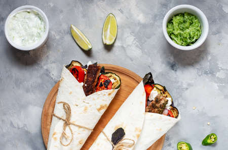 Wrap sandwich with grilled vegetables and meat on concrete background. Top view.