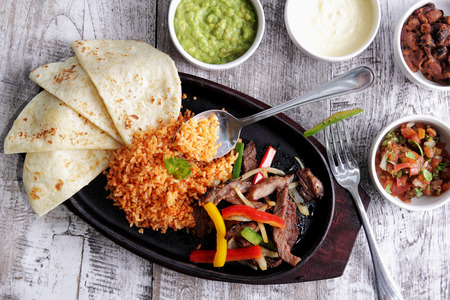 portrait of mexican cuisine fajitas served with soft flour tortillas, rice, bean chili, salsa, guacamole and sour cream