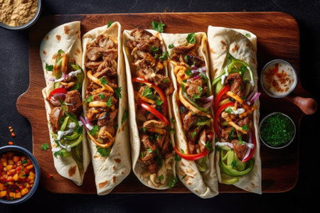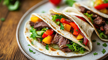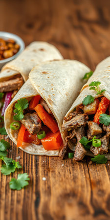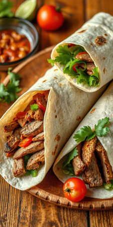 Deliciously wrapped beef tortillas with fresh vegetables and salsa on a wooden platter