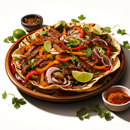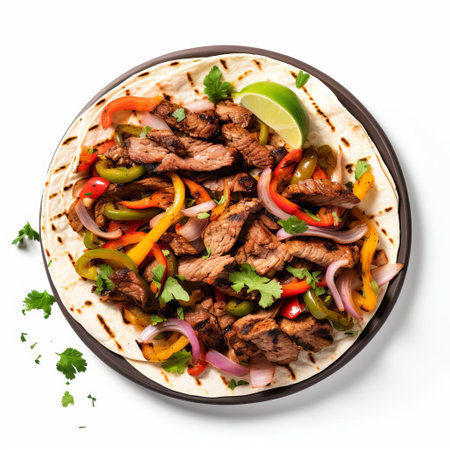 sizzling fajitas, loaded with tender beef strips, crunchy bell peppers, and onions, are perfectly arranged on a pristine white background, showcasing the vibrant colors and appetizing texture of this mouthwatering mexican dish, ideal for food bloggers and culinary enthusiasts. ai generated