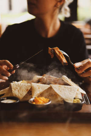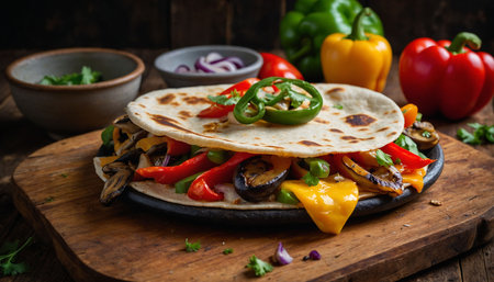 Mexican quesadilla with grilled vegetables on rustic wooden background