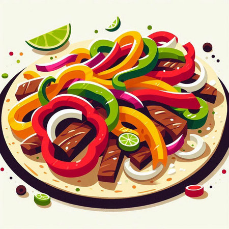 Mexican food illustration with beef steak, bell pepper, onion and lime