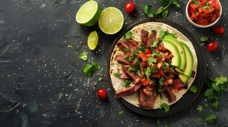 A mouthwatering view of tacos filled with grilled steak and fresh vegetables, garnished with vibrant salsa, ideal for showcasing culinary delights and tempting food lovers.